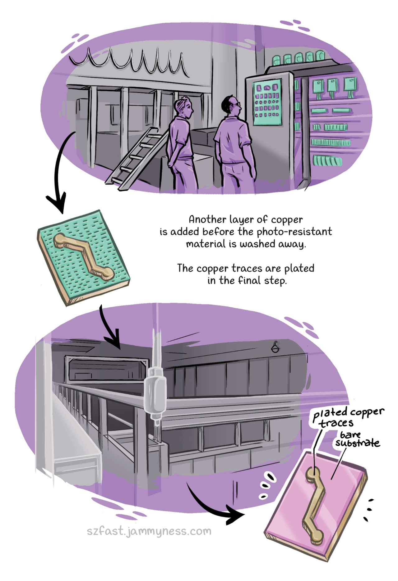p3: A plating bath is shown (t looks like a large pool). The final PCB can be seen with plated copper traces and the bare substrate (PCB material) free of photo-resistant material.