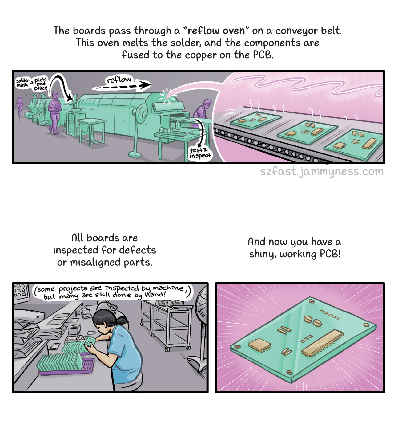 All boards are inspected for defects or misaligned parts. Some projects are inspected by machine, but many are still done by hand!