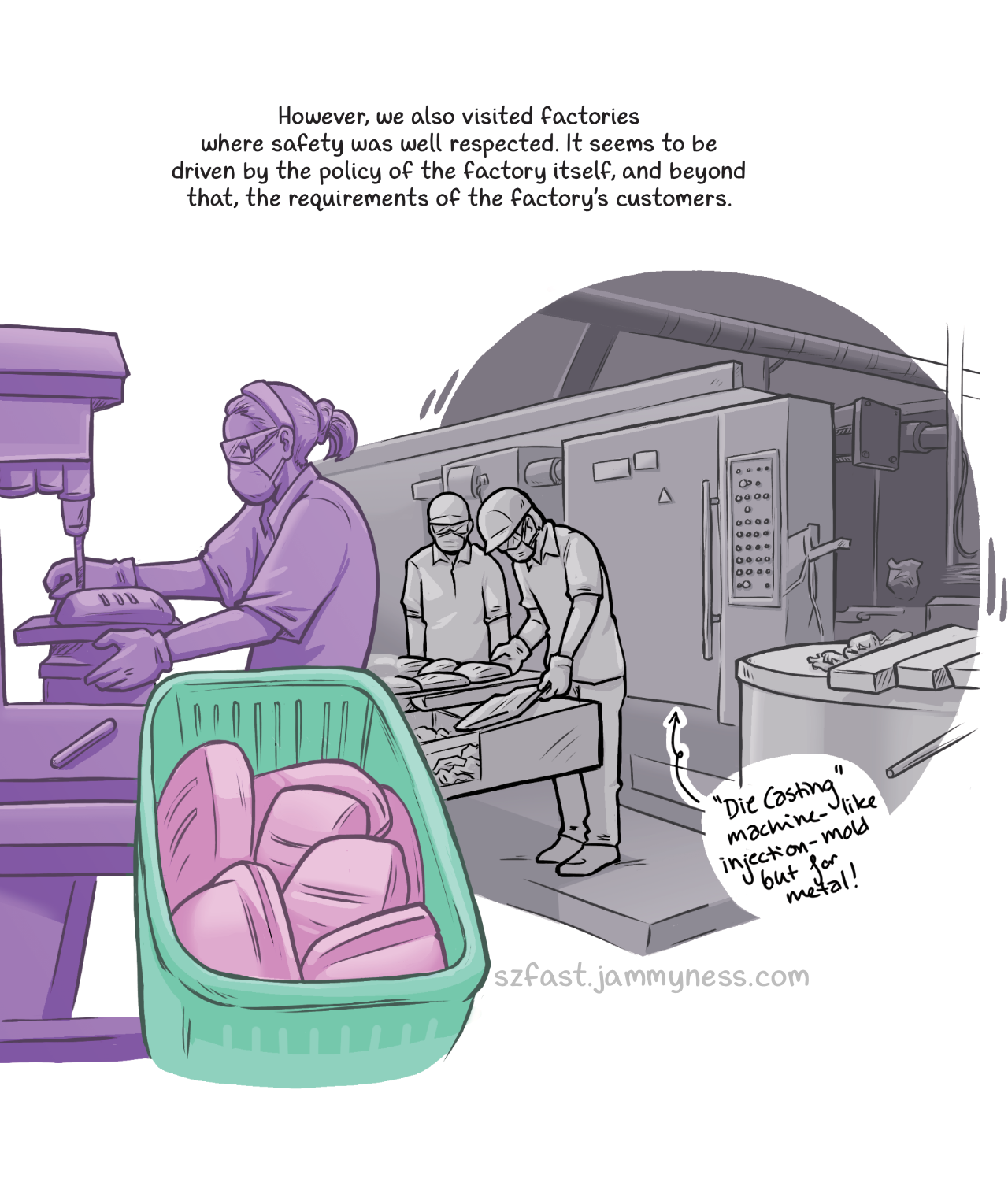 However, we also visited factories where safety was well respected. It seems to be driven by the policy of the factory itself, and beyond that, the requirements of the factory's customers.