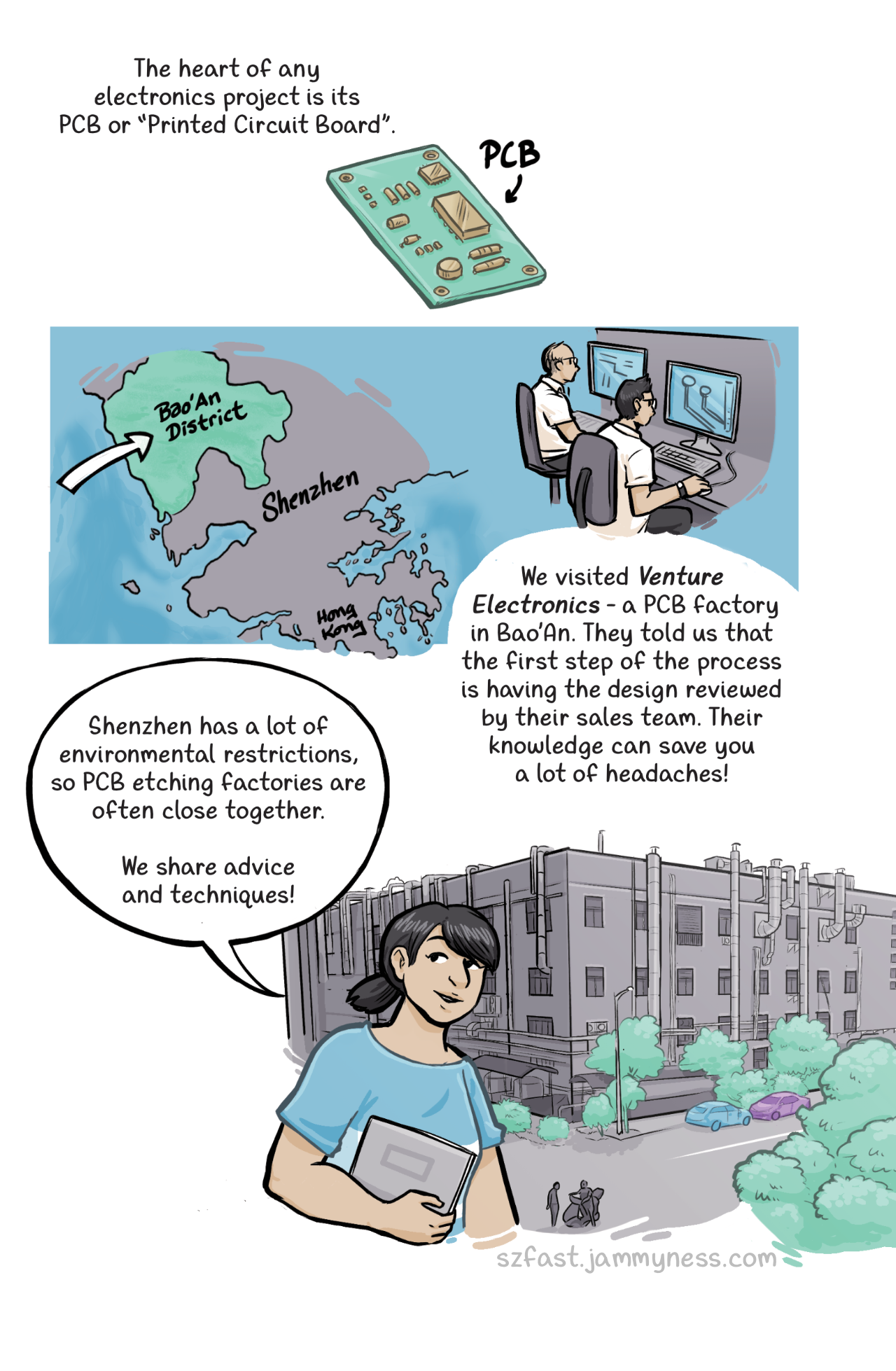 Fiona: "Shenzhen has a lot of environmental restrictions, so PCB etching factories are often close together. We share advice and techniques!"